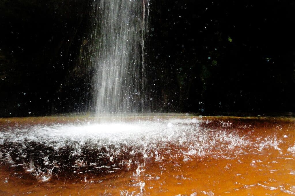 No topo da gruta, uma fissura faz com que a água que escorre forme uma cascata, que desemboca em uma piscina natural.
